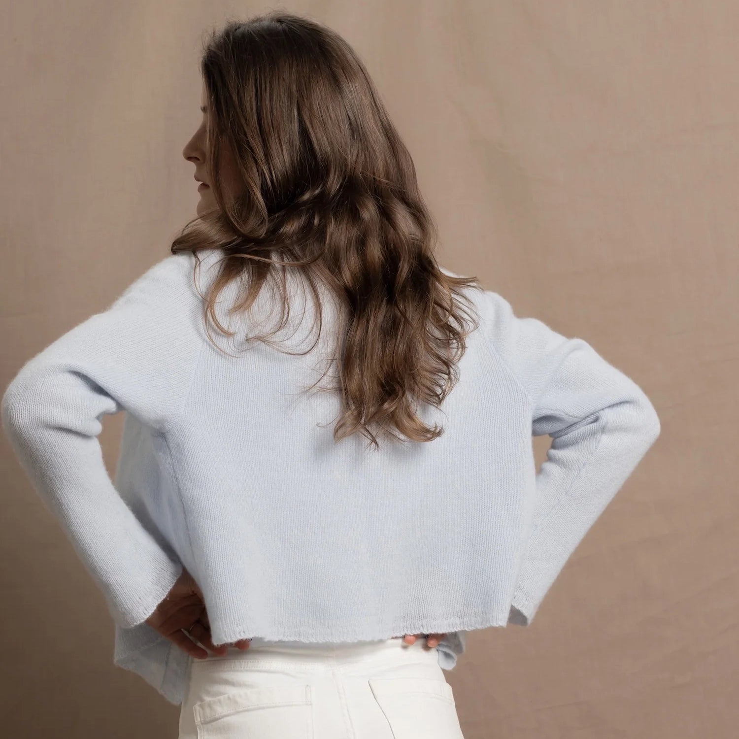 This classically-styled piece is feather light, with a decorative flutter trim and a fine, loose weave. Cropped in length, so that it lends itself perfectly for layering, with one button at the top for easy fastening.