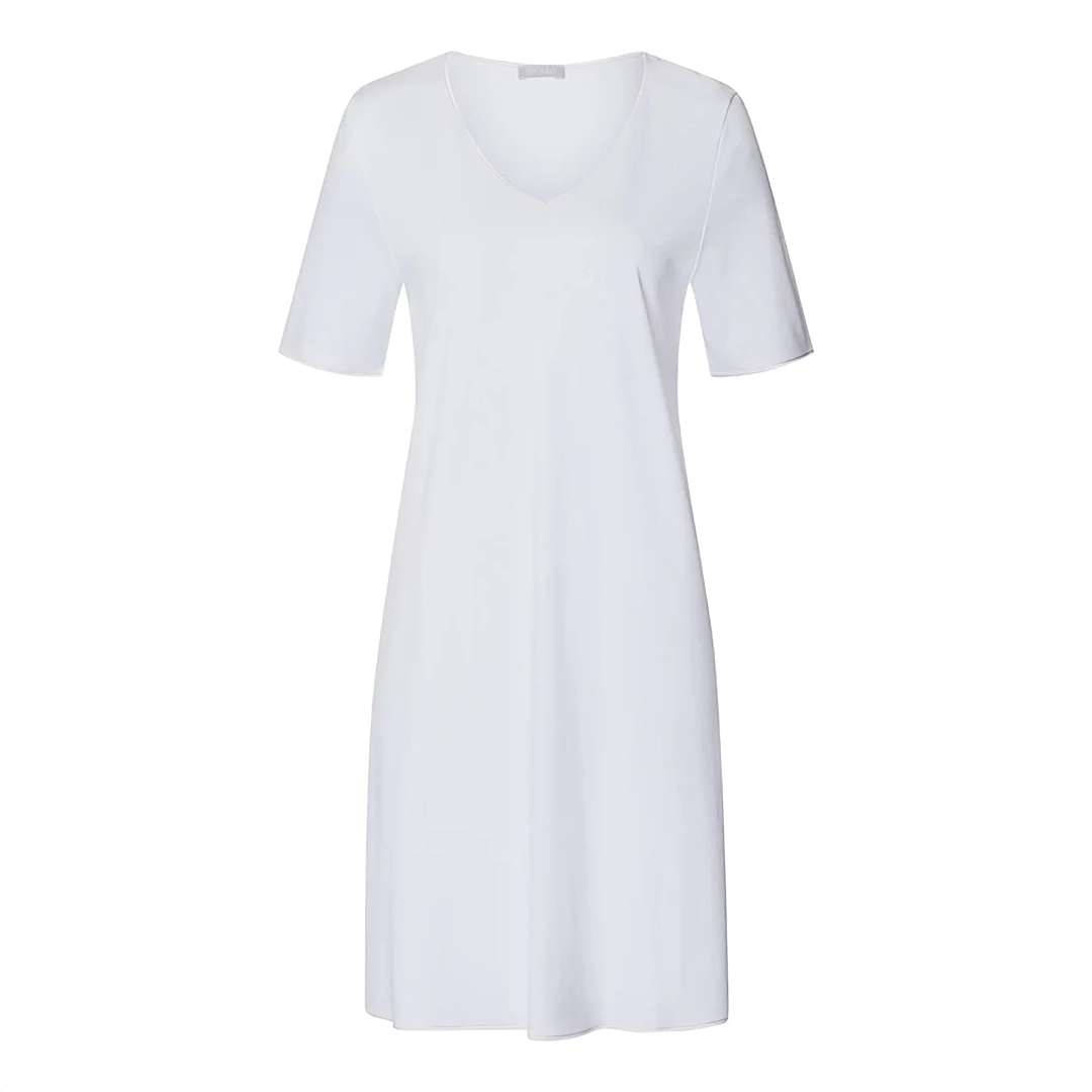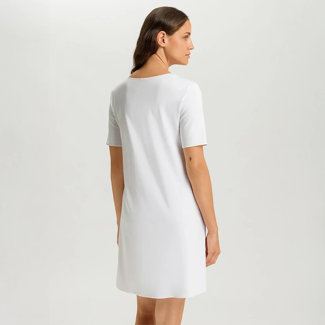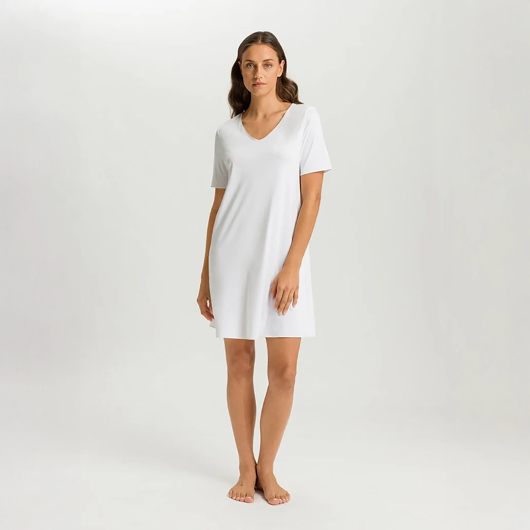 Embrace modern comfort with Hanro Cotton Silk Short-Sleeved Nightdress. This piece features a soft, mercerised cotton interlock construction, enhanced by subtle silk details. The short sleeves and ideal length of 90cm makes it perfect for a stylish and comfortable night's rest or relaxed lounging.