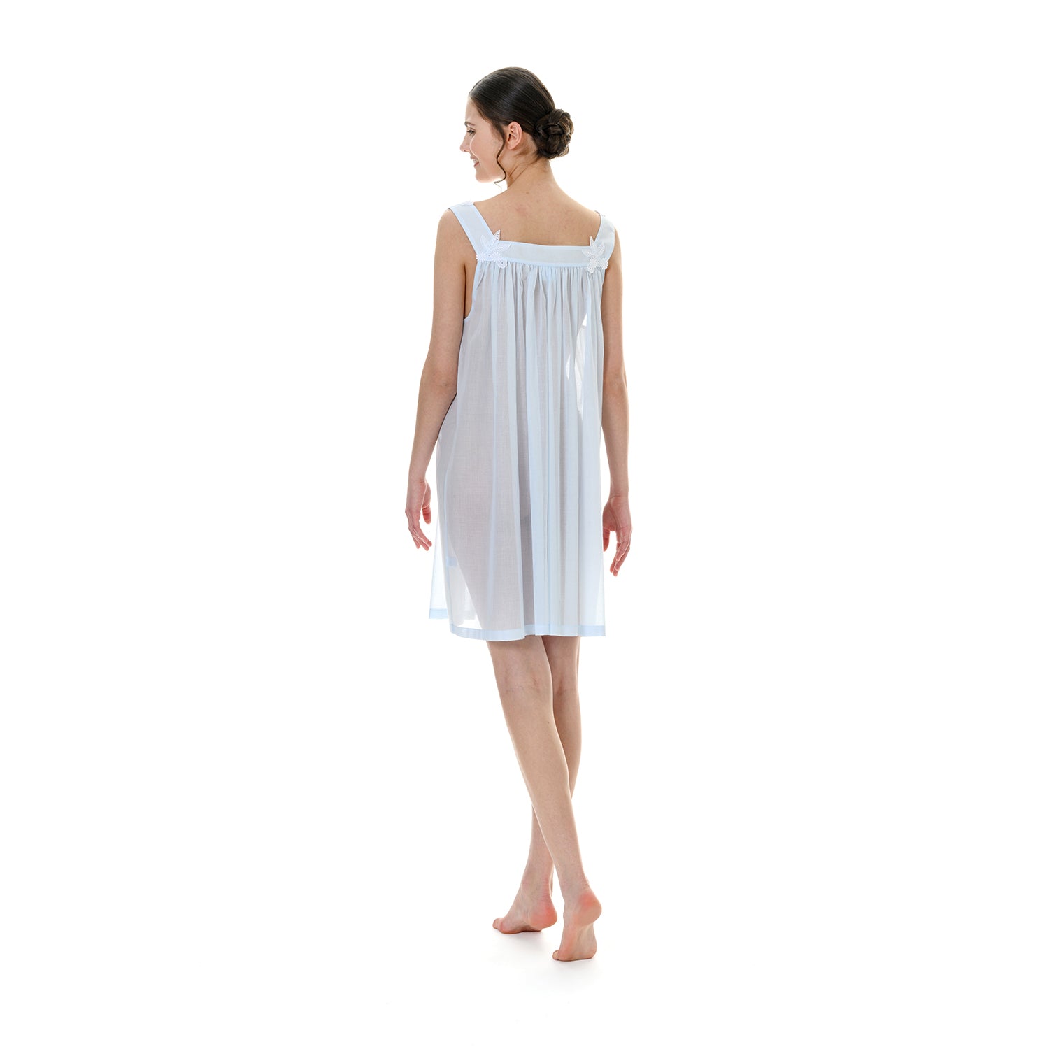 Short (94cm) sleeveless nightgown. Gorgeous 100% Guipure Cotton Lace at the gently rounded neckline. Flared skirt for ease of movement when sleeping. Made in Germany from the finest pure cotton mousseline, Celestine nightdresses are diaphanous, offering perfect sleep without heaviness.