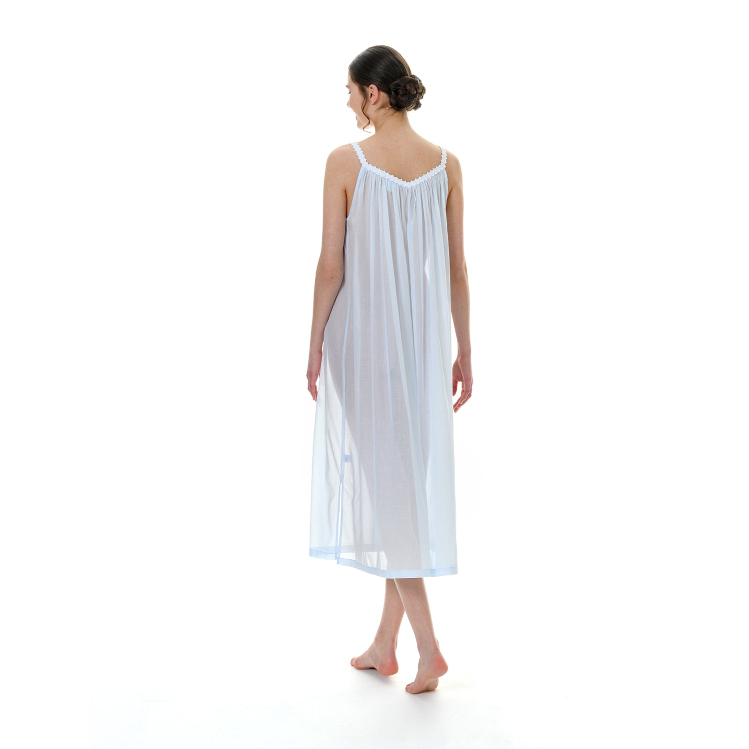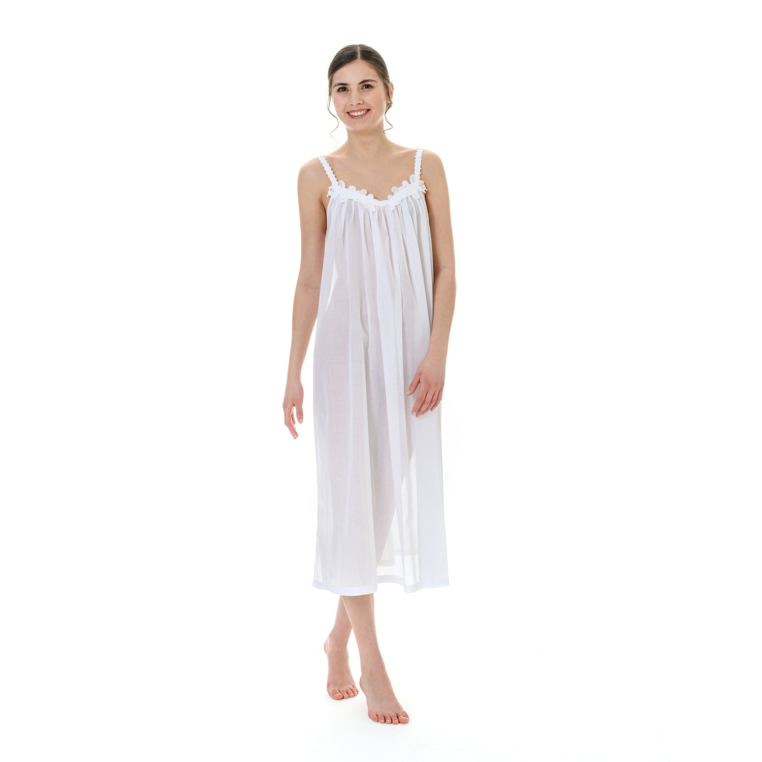 Full length (123cm) short sleeve nightgown. Gorgeous lace at the neckline. Flared skirt for ease of movement when sleeping. Made in Germany from the finest pure cotton mousseline, Celestine nightdresses are diaphanous, offering perfect sleep without heaviness.