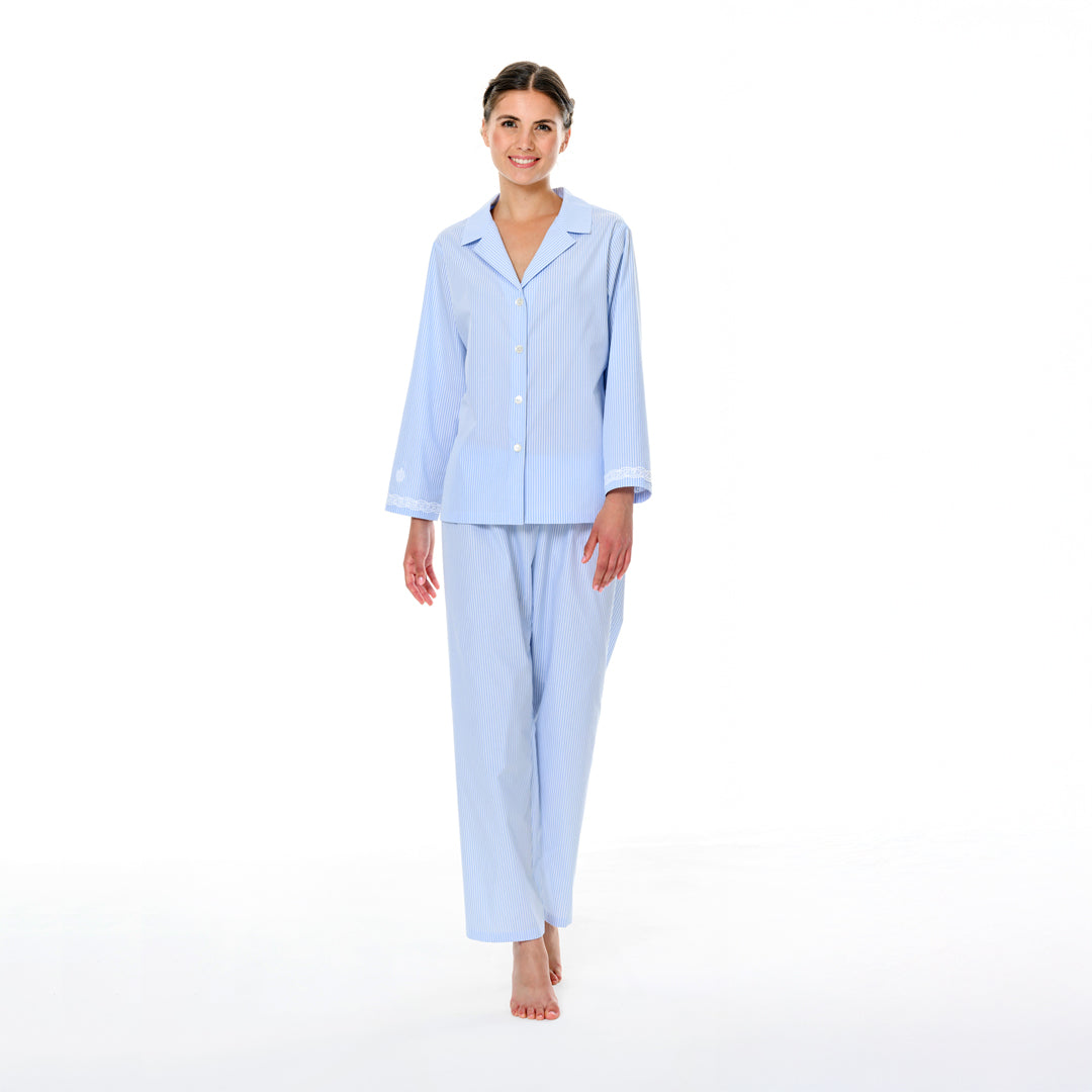 Blue & white stripe pure cotton pyjamas trimmed with 100% cotton guipure lace. Front buttoned with a revere collar. Full length trouser with a soft elasticated waist. Perfect for sleeping or lounging.