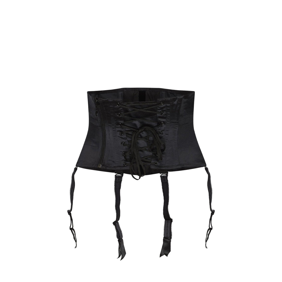 This is a fabulous waspie. Its clever boning draws in the waist with its strong lacing at the back, by the way, making a very attractive rear view! The lacing back also allows for extra cms when sizing. The zip at side gives an easy release. The suspenders are removable. allowing for wear both and inner and outerwear.
